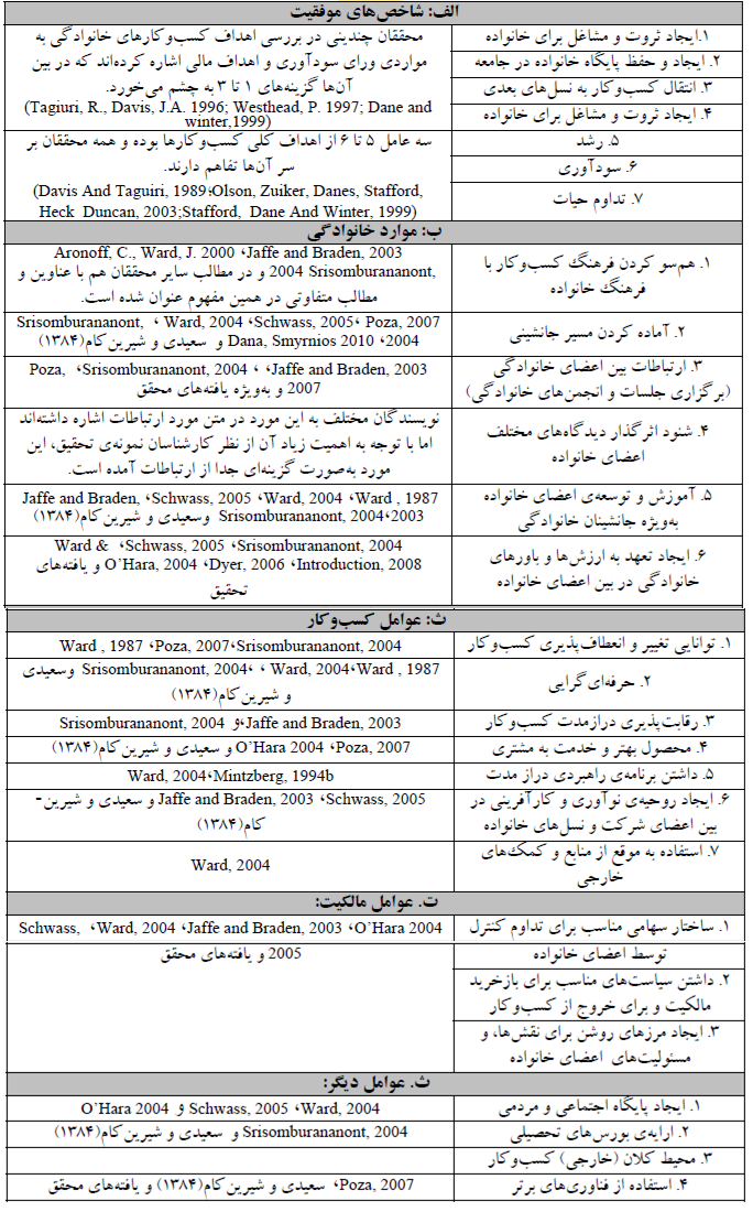 در بخش مروری بر ادبیات و پیشینه تحقیق اشاراتی داشته است که نویسندگان و نظریه پردازان مختلف چه نظریاتی را در ارتباط با عوامل مهم موفقیت در کسب و کارهای خانوادگی ارایه کرده اند. در این بخش به افراد زیر و نظریات آن ها اشاره می نمایند: